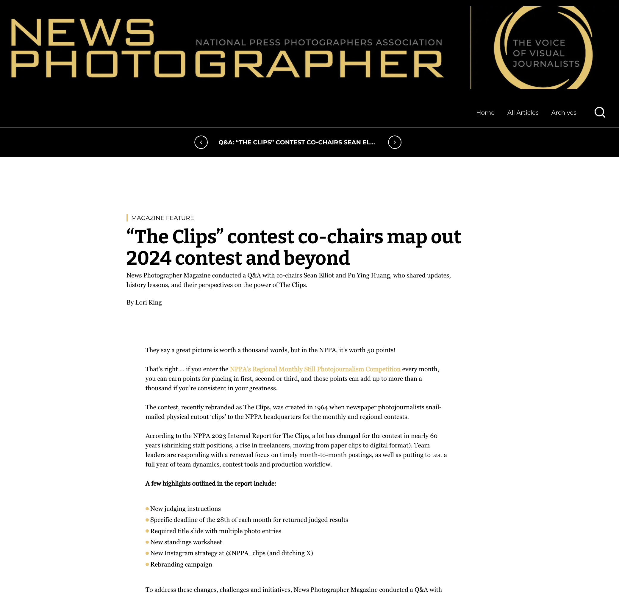 According to the NPPA 2023 Internal Report for The Clips, a lot has changed for the contest in nearly 60 years (shrinking staff positions, a rise in freelancers, moving from paper clips to digital format). Team leaders are responding with a renewed focus on timely month-to-month postings, as well as putting to test a full year of team dynamics, contest tools and production workflow.