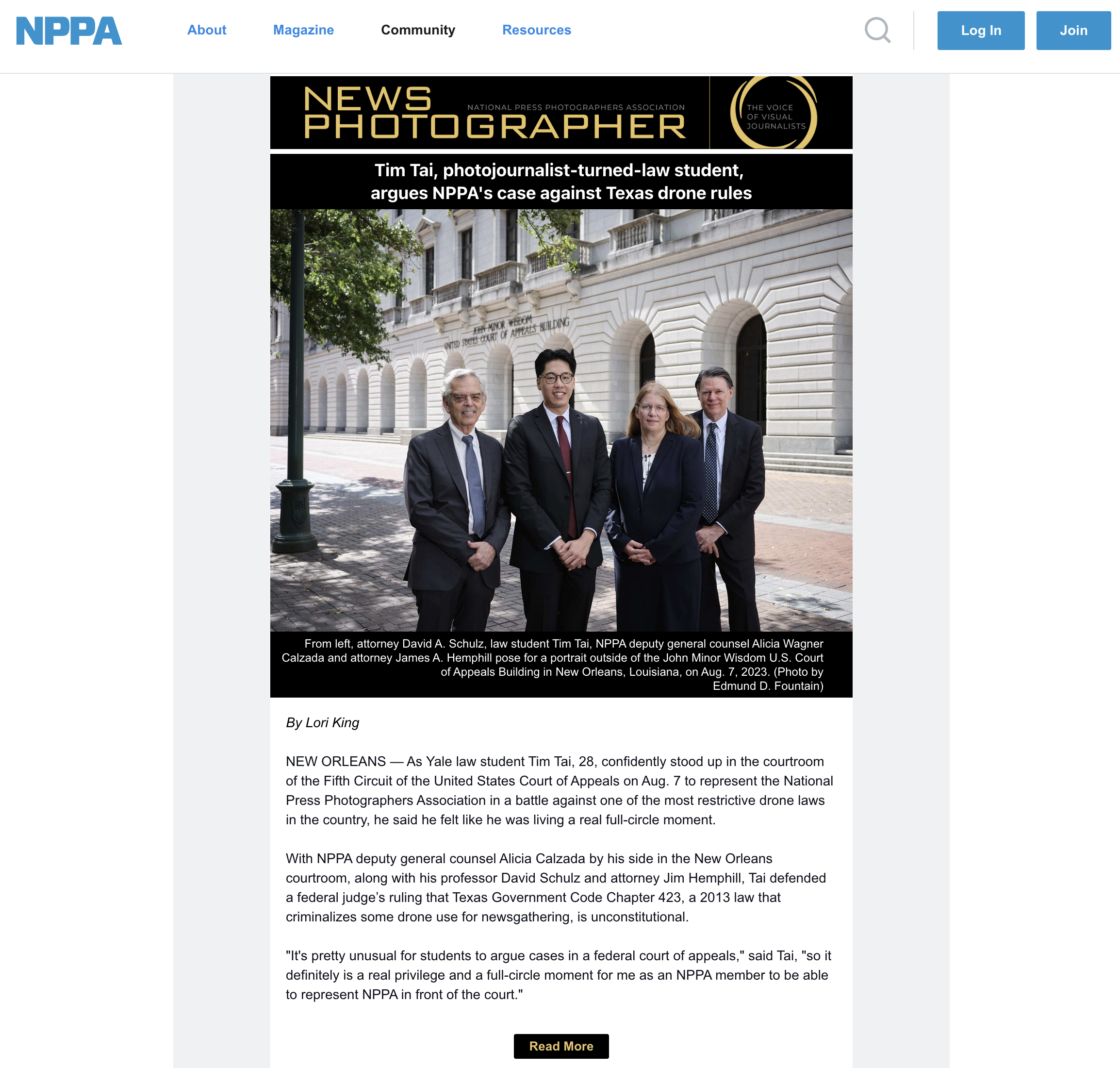 NEW ORLEANS -- As Yale law student Tim Tai, 28, confidently stood up in the courtroom of the Fifth Circuit of United States Court of Appeals on Aug. 8 to represent NPPA in a battle against one of the most restrictive drone laws in the country, he said he felt like he was living a real full-circle moment.